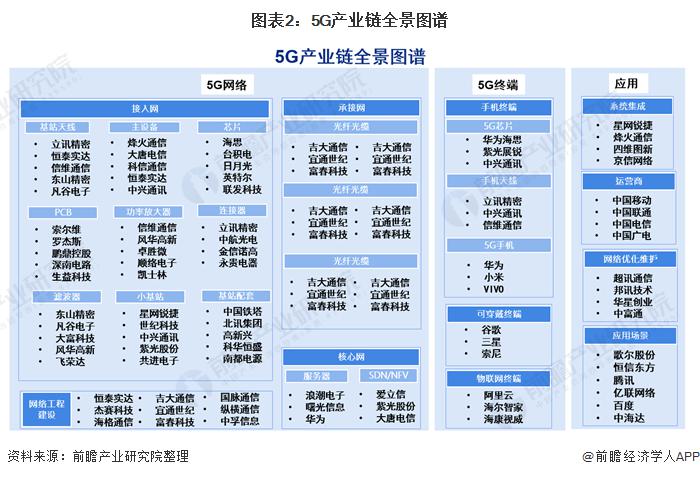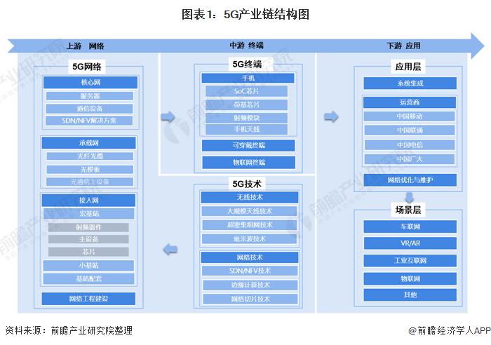 產業鏈上游由構建 5G 網絡的核心技術和 5G 網絡基礎設施構成,中游為應用 5G 網絡的終端,下游為 5G 網絡運營維護和應用。