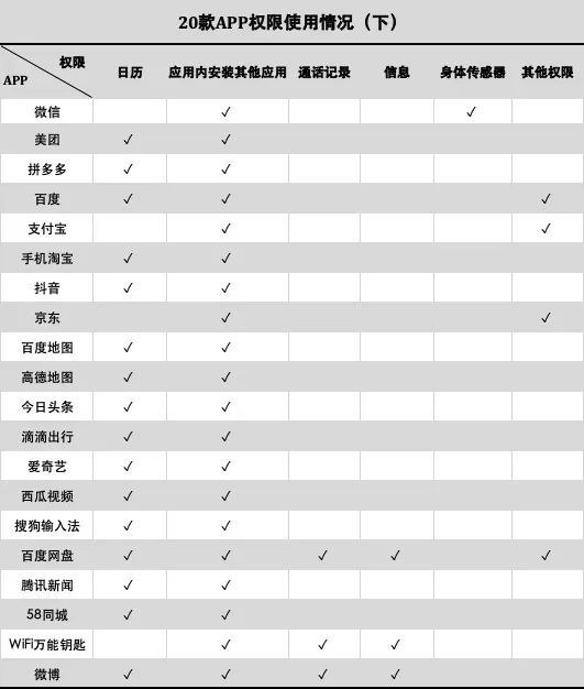 從安卓手機的權限管理界面可以看到,在測試的20款頭部APP中,其中17款APP都涉及到了通訊錄權限,大多都只是“讀取聯系人” ,但百度網盤、微博、微信等3款APP則更進一步,其通訊錄權限還包括“新建/修改/刪除聯系人”一項。