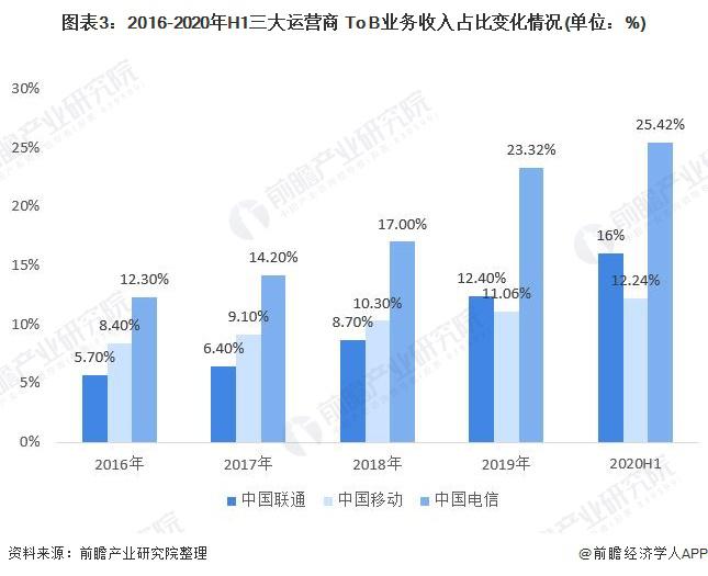 2019 年中國聯通實現產業互聯網營業收入達 329 億元,同比增長 43%,占整體主營業務收入比重達到 12.4%。2020 年上半年中國聯通產業互聯網業務收入同比增長 36%,達到人民幣 227 億元,占整體主營業務收入比例提高至 16%,占比超過中國移動,但總收入仍然低于其他兩家運營商。