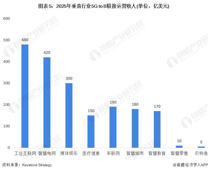 5G 2B 行業應用中,工業制造、智慧電網、媒體娛樂、車聯網、智慧城市和智慧教育等垂直行業都存在剛性的聯接訴求,2025 年八大垂直行業中,工業互聯網、智慧電網、媒體娛樂 5G to B 聯接運營收入排行前三位,工業互聯網中的 5G to B 聯接運營收入接近 500 億美元。