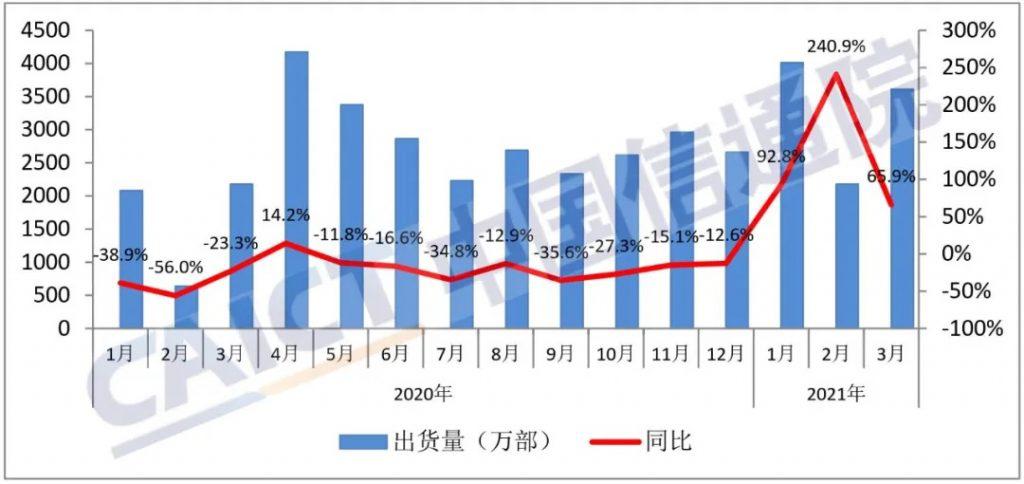 中國信通院發(fā)布了 2021 年 3 月國內(nèi)手機市場運行分析報告。報告顯示,3 月國內(nèi)手機市場總體出貨量 3609.4 萬部,同比增長 65.9%。
