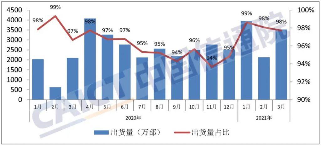 2021 年 3 月,智能手機出貨量 3526.8 萬部,同比增長 67.7%,占同期手機出貨量的 97.7%。1-3 月,智能手機出貨量 9618.2 萬部,同比增長 101.5%,占同期手機出貨量的 98.2%。
