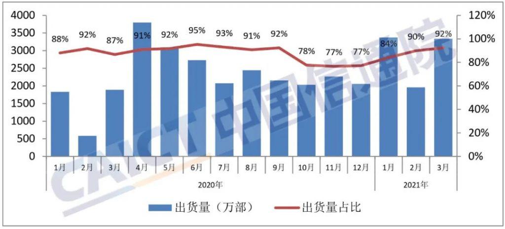 2021 年 3 月,國內(nèi)市場 5G 手機出貨量 2749.8 萬部,占同期手機出貨量的 76.2%;上市新機型 16 款,占同期手機上市新機型數(shù)量的 39.0%。1-3 月,國內(nèi)市場 5G 手機出貨量 6984.6 萬部、上市新機型 64 款,占比分別為 71.3% 和 52.5%。