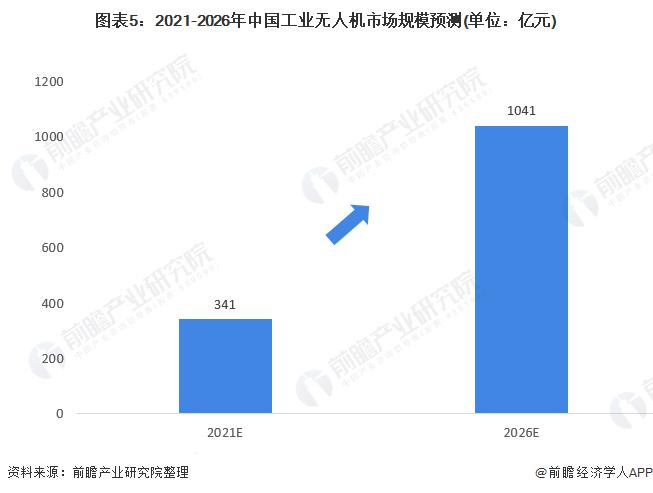 2020 年,我國工業無人機市場規模約為 273 億元,若以 25% 增長率對工業無人機行業市場規模進行測算,2026 年,我國工業無人機市場規模約達 1041 億元。