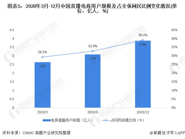 2021 年 2 月,CNNIC 發布《第 47 次中國互聯網絡發展狀況統計報告》,根據報告數據,截至 2020 年 3 月,我國電商直播用戶規模為 2.65 億人,增長迅速。截至 2021 年 12 月,我國直播電商用戶規模達 3.88 億人,占網民整體的 39.2%。