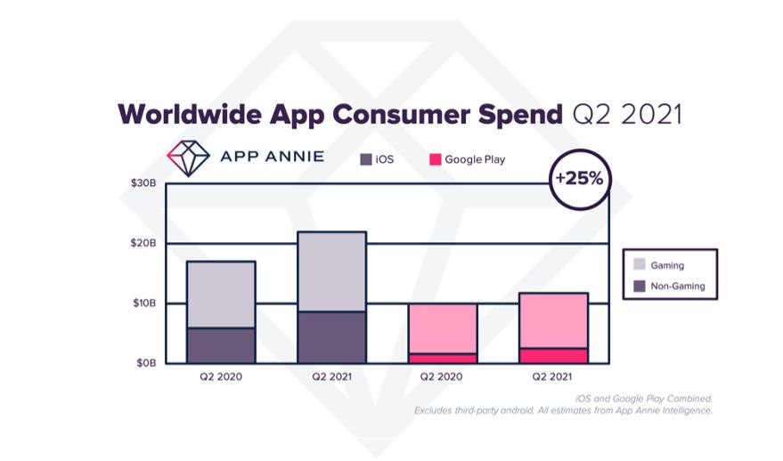 在 2021 年第二季度,消費者在移動應用上花費了 340 億美元。打破了第一季度的 320 億美元。2021 年第二季度的消費總額比 2020 年第二季度的總額高出約 70 億美元,比 2021 年第一季度高出 20 億美元。按平臺劃分,App Annie 的數據顯示,2021 年第一季度,蘋果應用商店的支出同比增長 30%,達到 220 億美元,而 Google Play 的支出躍升 20%,達到約 120 億美元。