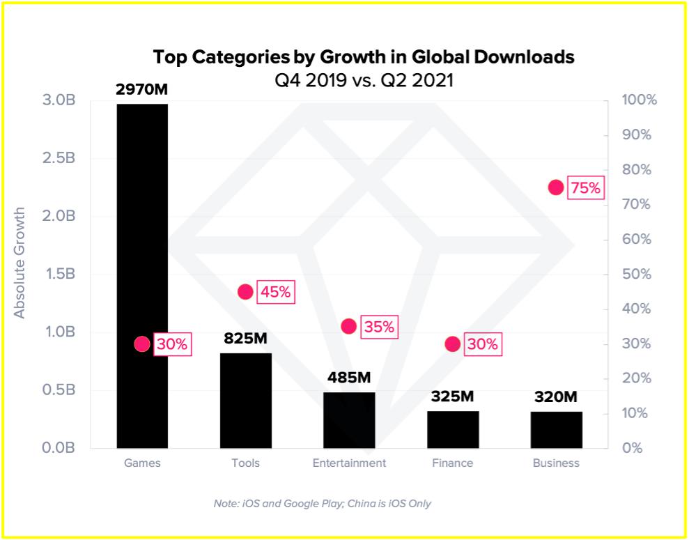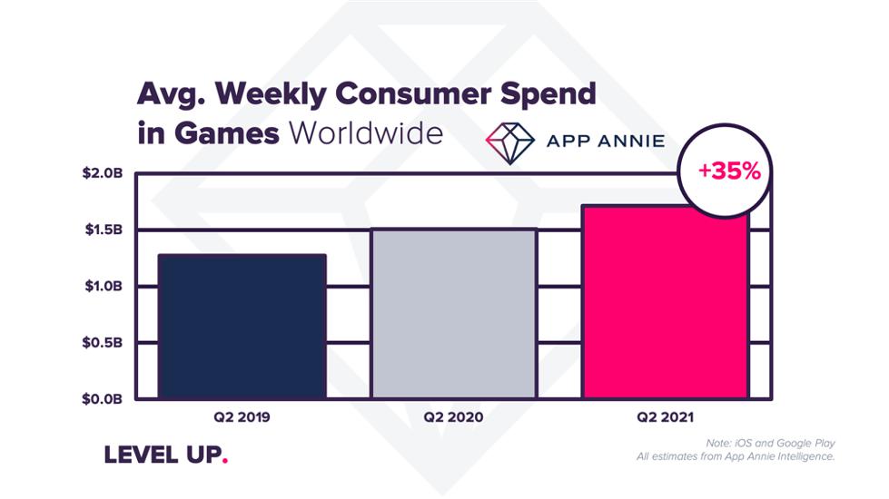 2021 年第二季度,游戲領域保持了去年建立的高增長勢頭。每周平均下載量連續五個季度保持在 10 億左右。這與 2019 年的平均水平相比,增長了 15%。同時,就支出而言,每周平均數徘徊在 17 億美元左右。這與 2021 年第一季度相同,但比兩年前的數字增長了 35%。