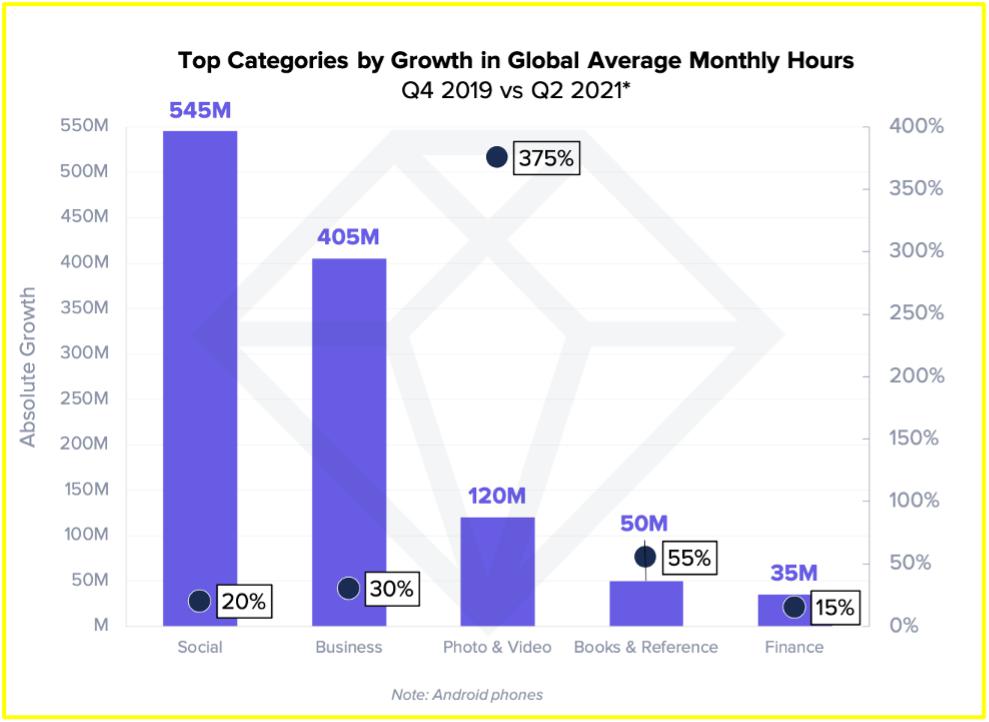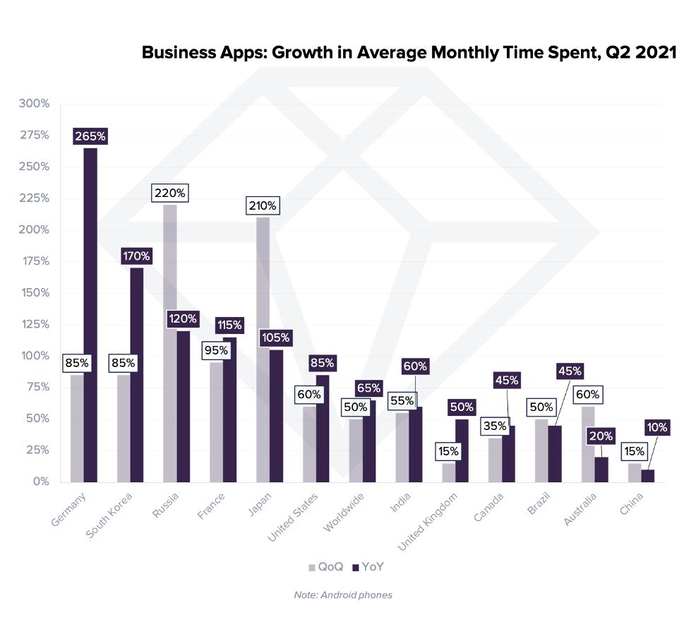 2021 年第二季度用戶在商務應用上使用時長月平均增長數據