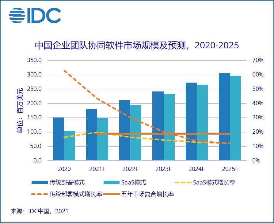 IDC 預測,到 2025 年,中國企業團隊協同軟件市場規模將達到 6.02 億美元,未來 5 年整體市場年復合增長率(CAGR)為 18.8%。未來,SaaS 模式的企業團隊協同軟件的增速高于傳統部署模式,企業團隊協同 SaaS 軟件的未來 5 年復合增長率為 23.3%。到 2025 年,SaaS 模式的企業團隊協同軟件市場份額將達到整體市場的一半左右。