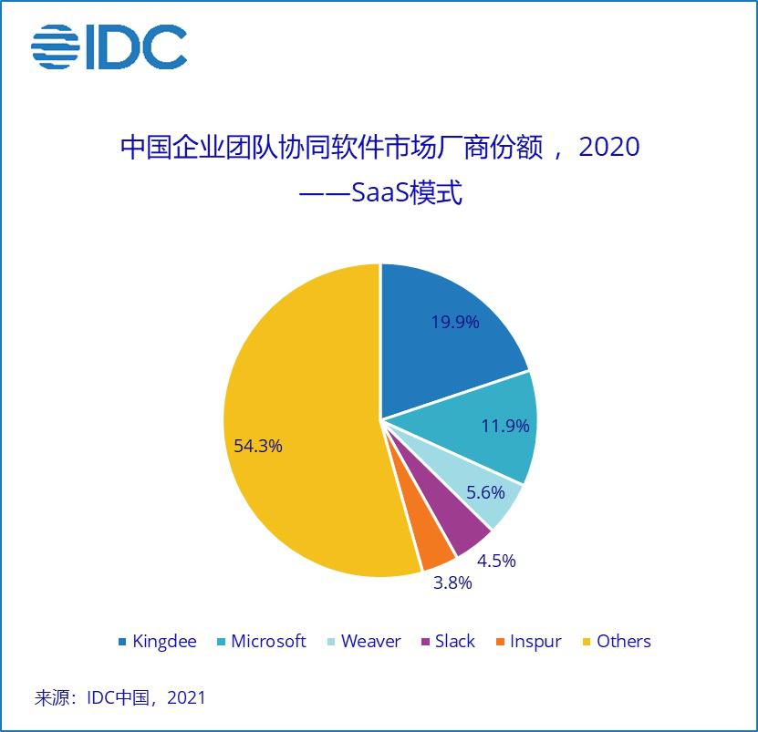 在 SaaS 模式市場中,金蝶云之家(Kingdee-Cloudhub)以 19.9% 的市場份額排名第一,金蝶云之家以企業移動辦公場景為切入點,提供社交化協同產品,業務聚焦于服務中大型企業用戶;微軟(Microsoft)以 11.9% 的市場份額排名第二,微軟在 2020 年加大了 Teams 產品的推廣力度,產品的活躍用戶獲得較大提升;泛微(Wearver)以 5.6% 的市場份額排在第三位。