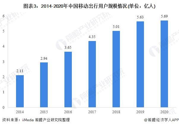 根據 iiMedia 數據顯示,2014 到 2019 年中國移動出行的用戶規模持續增長,在 2018 年突破 5 億人,在 2019 年達到 5.63 億人,2020 年受到新冠疫情居家政策的影響,人們紛紛宅在家中,出行行業受到一定的打擊,用戶規模增速明顯放緩,2020 年中國移動出行用戶規模約為 5.69 億人。