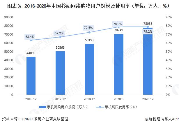 截止 2020 年底,我國(guó)手機(jī)網(wǎng)絡(luò)購(gòu)物用戶規(guī)模達(dá) 78058 萬(wàn)人,較 2020 年 3 月增長(zhǎng) 7309 萬(wàn)人,占手機(jī)網(wǎng)民規(guī)模的 79.2%。