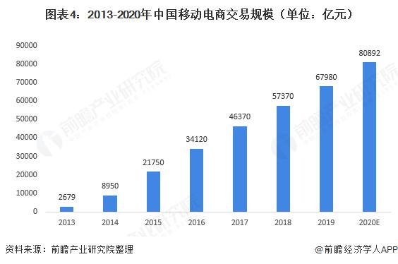 移動(dòng)端一直作為電商平臺(tái)發(fā)展重要渠道,隨著近年直播電商市場(chǎng)爆發(fā),移動(dòng)電商交易規(guī)模繼續(xù)升級(jí)。數(shù)據(jù)顯示,從 2013 年的 2679 億元到 2019 年的 67580 億元,中國(guó)移動(dòng)電商市場(chǎng)交易額持續(xù)增長(zhǎng)。2020 年中國(guó)移動(dòng)電商市場(chǎng)交易額預(yù)計(jì)突破八萬(wàn)億元。