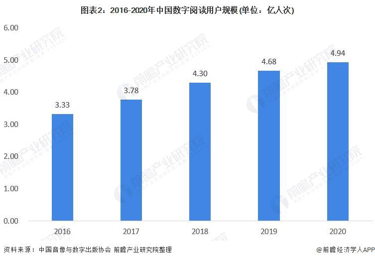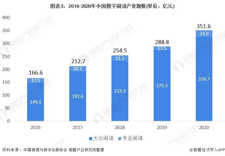 隨著人們對(duì)數(shù)字閱讀方式的認(rèn)同,近年來我國數(shù)字閱讀市場(chǎng)持續(xù)增長。2020 年我國數(shù)字閱讀用戶規(guī)模已經(jīng)達(dá)到 4.94 億人次,較 2019 年增長 5.56%; 數(shù)字閱讀整體產(chǎn)業(yè)規(guī)模為 351.6 億元,較 2019 年增長 21.8%,其中大眾閱讀規(guī)模為 326.7 億元,專業(yè)閱讀規(guī)模為 24.9 億元。