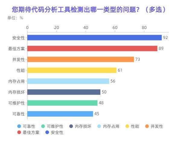 更有研究表示,對于開發者而言,其公司和團隊的制度很大程度上影響他們對于代碼分析工具的使用。同樣地,團隊對于安全問題重視,也提高了開發者對于代碼安全性的要求,有 40% 的開發者將安全問題排在首位考慮。這也就不難理解,為什么開發人員使用代碼分析工具時,最看重其對安全問題的檢測。
