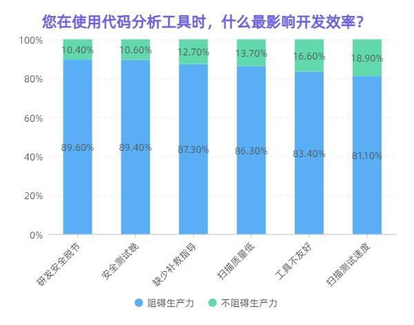我們可以看到,對于所有軟件開發過程的安全問題,都至少有 81% 的開發人員認為這降低了他們的生產效率。這反映了一個所有安全工具必須要面對的事實——開發人員并不愿意使用軟件安全檢測工具。