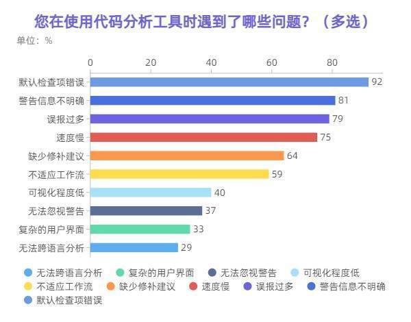 可以看到,開發人員進行代碼分析時,面臨最多的問題是安全工具默認開啟的檢查規則并不完全符合實際需求。顯而易見,幾乎所有安全工具研發時,都會力求滿足盡可能多類型項目檢測的需要,這使得安全工具的檢測規則有時較為冗雜,甚至包括強制開發人員采用特定規則命名變量,或是檢測注釋中的拼寫錯誤等等。