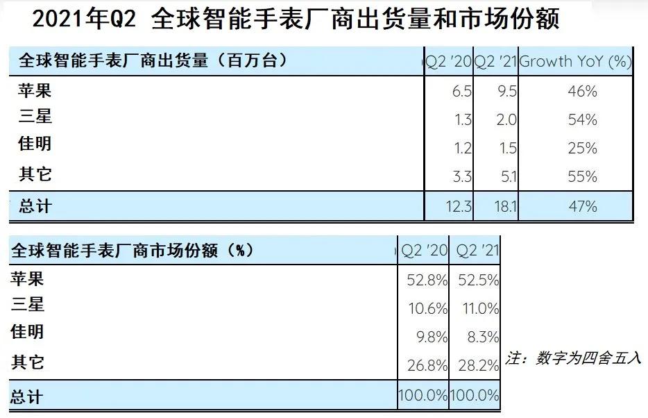 根據 Strategy Analytics 發布的最新研究報告,2021 年第二季度,全球智能手表出貨量達到 1800 萬,比去年同期增長了 47%。Apple Watch 以 52% 的市場份額保持第一,三星位居第二,佳明位居第三。