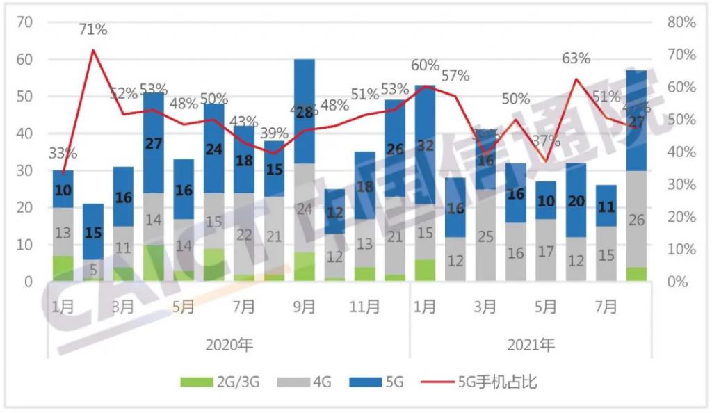 2021 年 8 月,國內手機上市新機型 57 款,同比增長 50.0%,其中 5G 手機 27 款,同比增長 80.0%,占同期手機上市新機型數量的 47.4%。