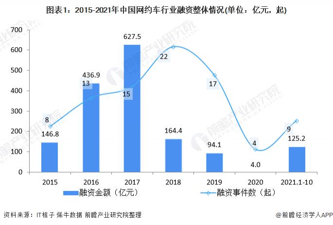 根據 IT 桔子數據庫,2018 年我國網約車行業(yè)融資金額達到頂峰,發(fā)生融資事件共 15 起,融資金額共 627.5 億元。2018 年后我國網約車行業(yè)遇冷,融資事件有所增長,但融資金額卻呈現 " 斷崖式 " 下跌。2019 年我國網約車行業(yè)發(fā)生融資事件 17 起,較上年下降 22.7%; 融資金額僅為 94.1 億元。截止 2021 年 10 月 26 日,我國網約車行業(yè)發(fā)生融資事件 9 起,融資金額為 125.2 億元。