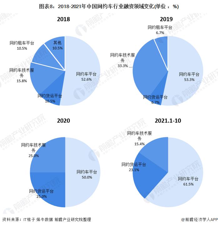 從融資企業(yè)的投資熱點變化趨勢分析,2018-2021 年網約車 ( 網約預約出租車 ) 平臺投資事件均占半數以上。網約車行業(yè)融資熱點主要集中在網約專車服務、拼車 / 順風車服務平臺,此外在網約車監(jiān)管、網約車廣告等技術服務領域投資事件亦占有一定份額。