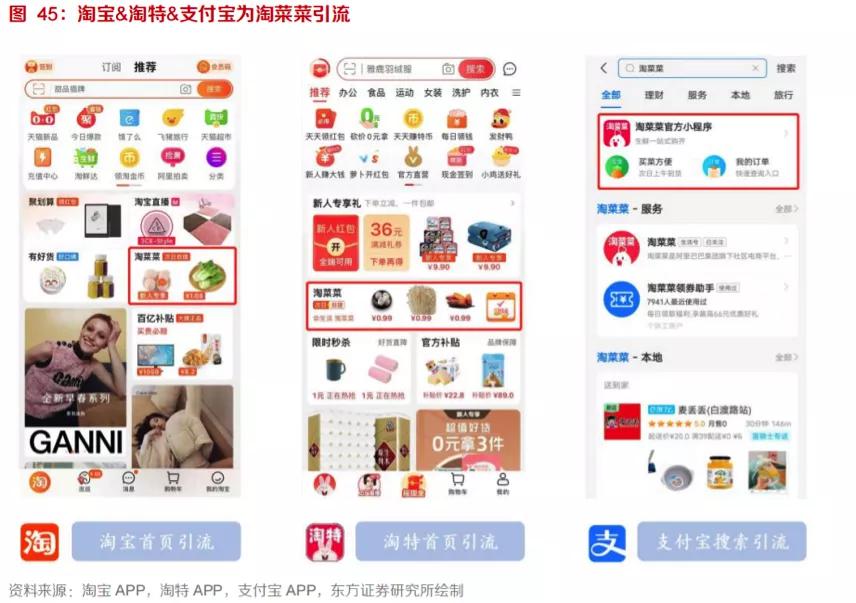 在用戶端,阿里在淘寶、淘特首頁(yè)的 banner 位設(shè)置淘菜菜引流口,支付寶在搜索中加入淘菜菜進(jìn)行引流支持,相比之前僅淘寶引流,流量支持力度接近 " 頂配 "。