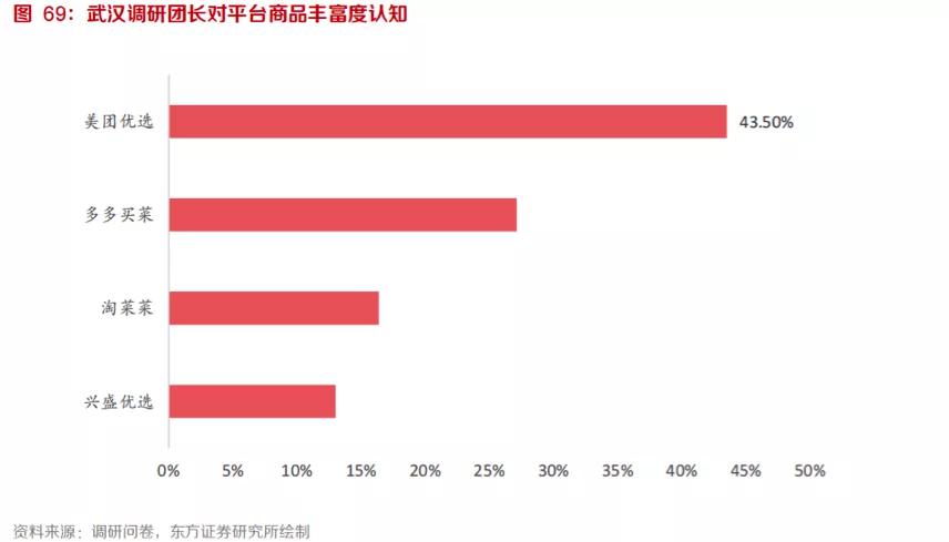 調(diào)研問(wèn)卷還顯示,美團(tuán)優(yōu)選商品豐富的觀點(diǎn)占領(lǐng)了更多團(tuán)長(zhǎng)心智。有 43.5% 的團(tuán)長(zhǎng)為美團(tuán)商品豐富度高,27.12% 的團(tuán)長(zhǎng)認(rèn)為多多買(mǎi)菜商品豐富度高,僅 16.38% 的團(tuán)長(zhǎng)認(rèn)為淘菜菜商品豐富度高。