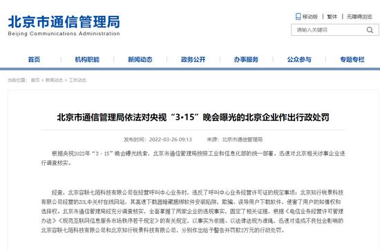 近日,北京市通信管理局公布對于 2022 年 "3 · 15" 晚會涉京企業的處罰結果。根據央視 2022 年 "3 · 15" 晚會曝光線索,北京市通信管理局按照工業和信息化部的統一部署,迅速對北京相關涉事企業進行調查核實。