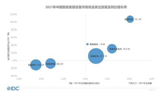 IDC《中國(guó)智能家居設(shè)備市場(chǎng)季度跟蹤報(bào)告,2021 年第四季度》顯示,2021 年第四季度中國(guó)智能家居設(shè)備市場(chǎng)出貨量為 6337 萬(wàn)臺(tái),同比增長(zhǎng) 4.1%。2021 年中國(guó)智能家居設(shè)備市場(chǎng)出貨量超過(guò) 2.2 億臺(tái),同比增長(zhǎng) 9.2%。雖然市場(chǎng)在供需雙方壓力之下并未出現(xiàn)兩位數(shù)的反彈,但出貨體量背后不可忽視的是中國(guó)智能家居市場(chǎng)的升級(jí)和調(diào)整。在不斷的優(yōu)化中,市場(chǎng)將迎來(lái)新的發(fā)展機(jī)會(huì),預(yù)計(jì) 2022 年中國(guó)智能家居設(shè)備市場(chǎng)出貨量將突破 2.6 億臺(tái),同比增長(zhǎng) 17.1%。