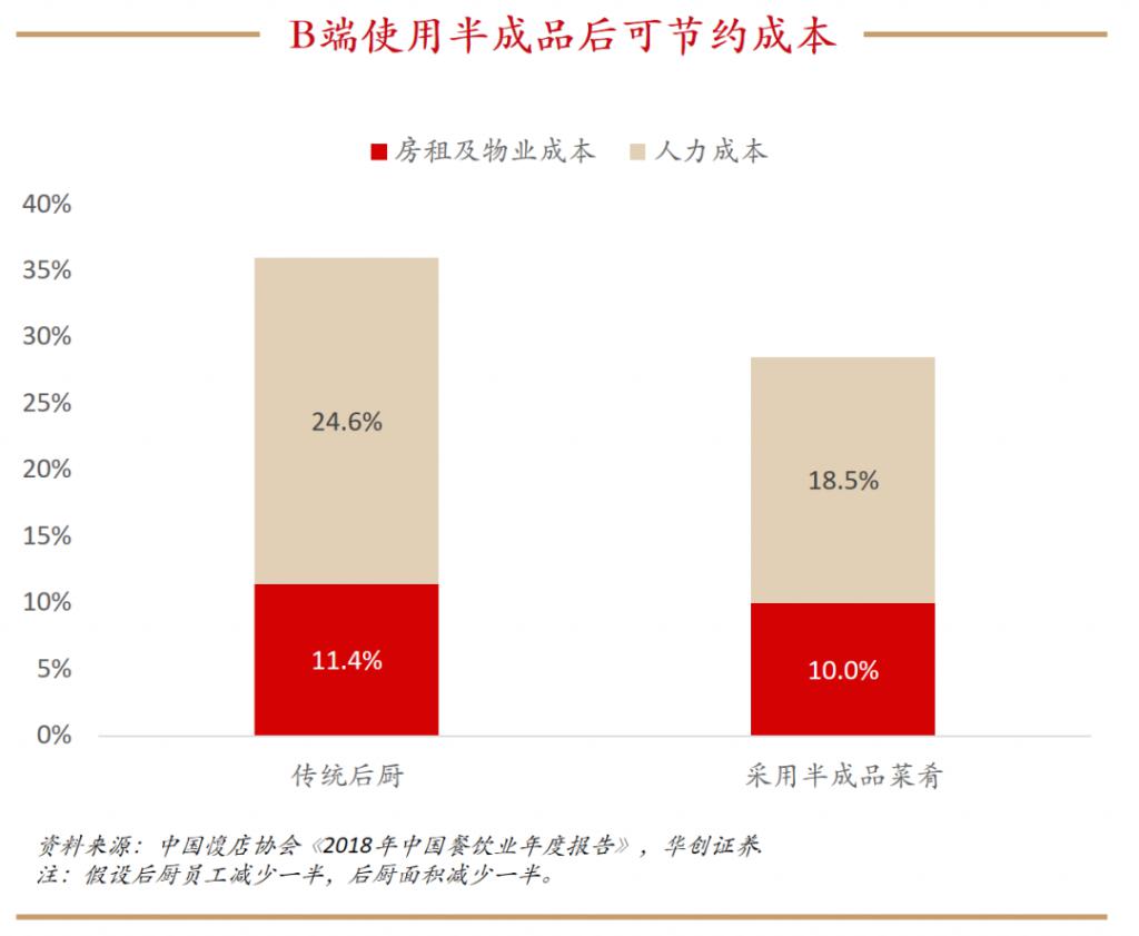 B 端:預制菜為餐飲企業提供的價值核心在于出品穩定、節約成本。通過采用半成品菜肴可以為企業降低后廚員工數量、后廚面積,并且基于集中采購與損耗降低等優勢有效節約成本,同時又能滿足顧客的口味、營養和就餐體驗需求。