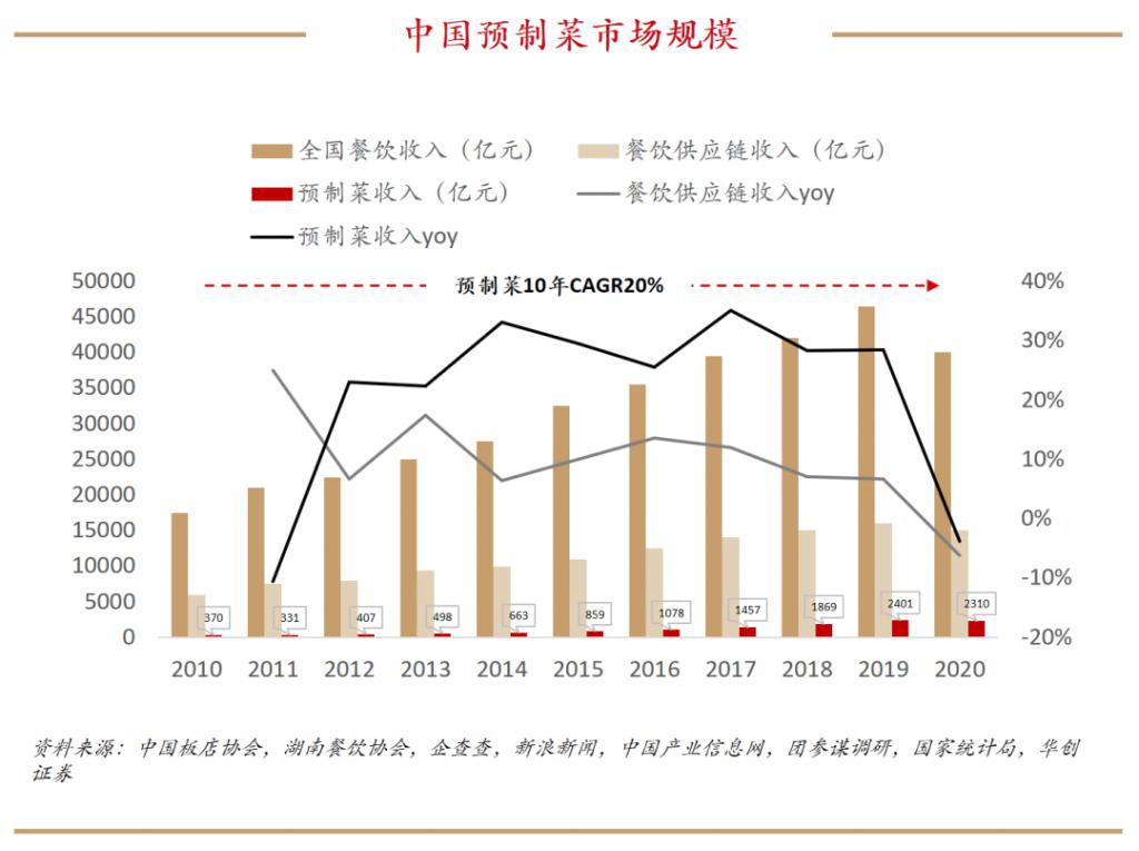 根據華創證券研報顯示,2020 年我國預制菜市場規模已達 2310 億元,2010-2020 年復合增長率高達 20%,未來十年有望達到近萬億元規模。