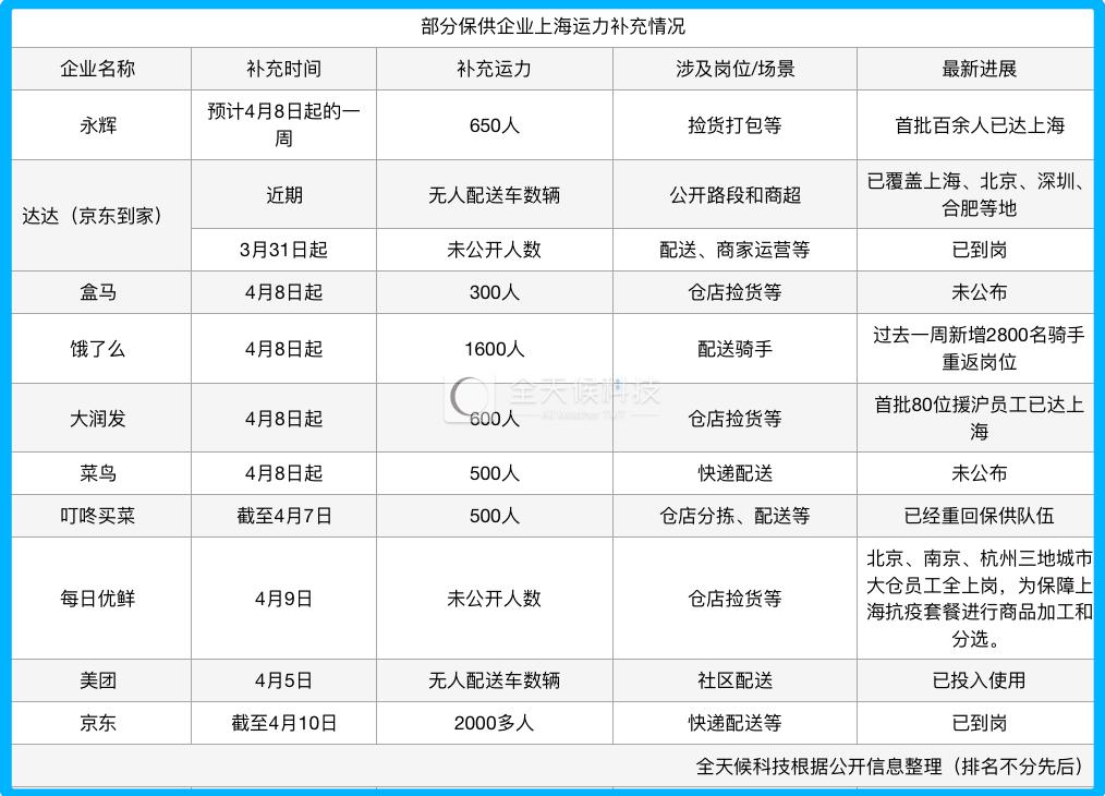 最新消息,餓了么、大潤發、盒馬、菜鳥等阿里系企業將新增抗疫保供人員 3000 人,其中,大潤發首批 80 位援滬員工已于 4 月 9 日下午抵達上海;叮咚買菜已召集近 500 名一線員工,重回保供隊伍;永輝預計未來一周將增調 650 人馳援上海 " 抗疫 " 保供。