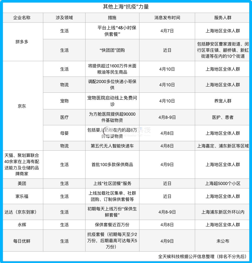 4 月 10 日,官方通報,截至 9 日,上海已有出院患者和解除醫學觀察人員 11000 多人。上海楊浦首批商超、便利店、餐飲等身邊小店和藥店正在陸續恢復運營,京東、拼多多、天貓等電商渠道也在逐步打通、接受訂單,每日優鮮、叮咚買菜等生鮮電商又開始回歸個人訂單業務,線上線下保障居民生活的行業都已啟動。