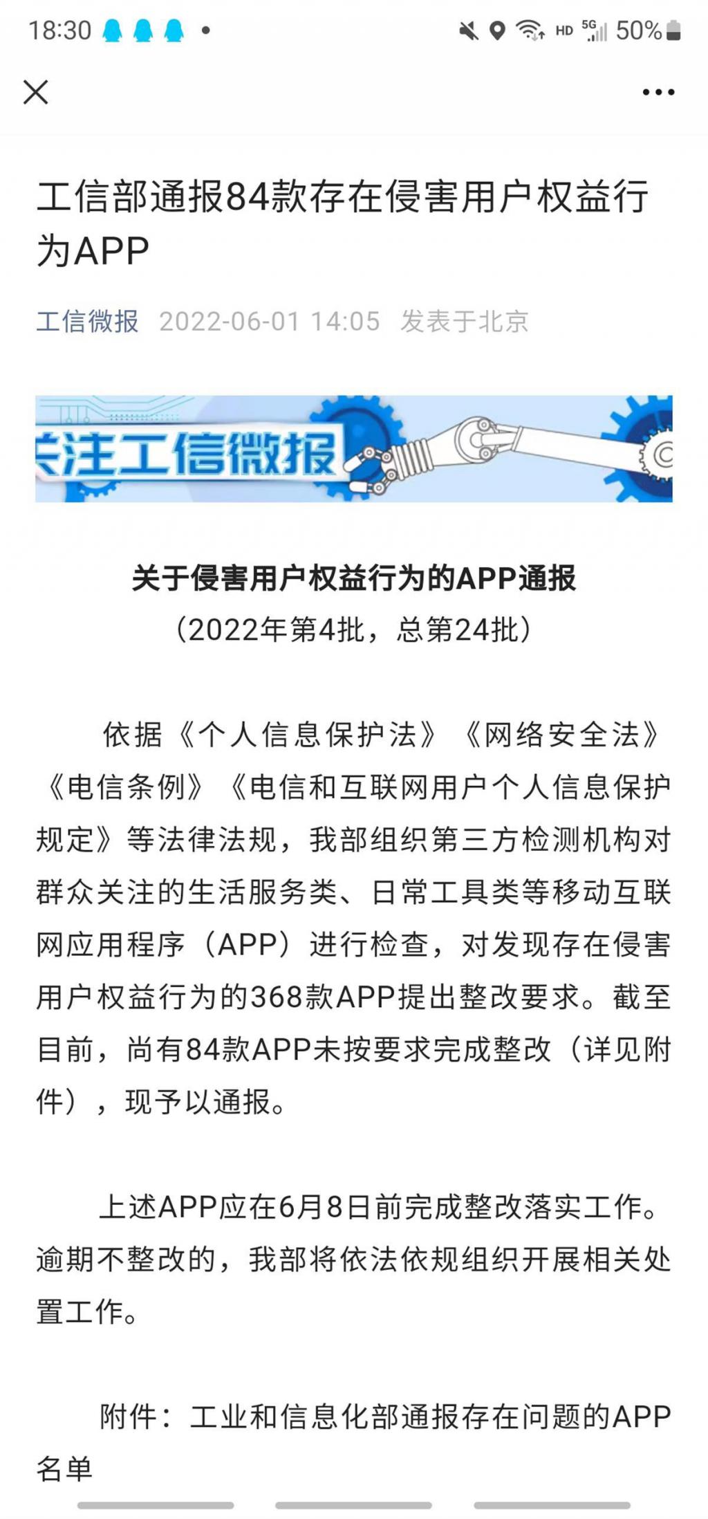 6 月 1 日下午,工業和信息化部通報今年第四批關于侵害用戶權益行為的 APP。通報稱,該部組織第三方檢測機構對群眾關注的生活服務類、日常工具類等移動互聯網應用程序(APP)進行檢查,對發現存在侵害用戶權益行為的 368 款 APP 提出整改要求。截至目前,尚有 84 款 APP 未按要求完成整改。