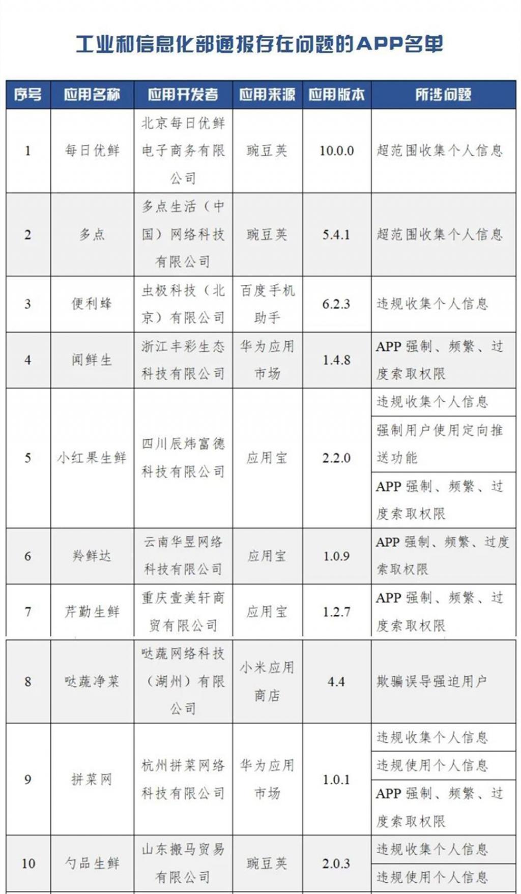 6 月 1 日下午,工業和信息化部通報一批存在侵害用戶權益行為且未按要求完成整改的 APP 名單。記者注意到,這 84 款 APP 當中,有 28 款為買菜軟件,存在的問題主要為過度或違規收集個人信息。這些 APP 當中,不乏每日優鮮、多點等使用人數較多的 APP,也有的 APP 已經無法使用。