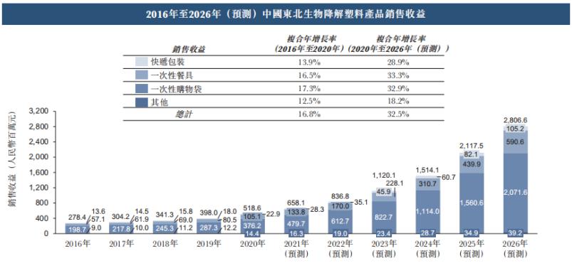 據此弗若斯特沙利文預計,中國可降解生物塑料的銷售收益將以 32.8% 的年均復合增長率增長,預計到 2026 年將達到 332.24 億元的市場規模。