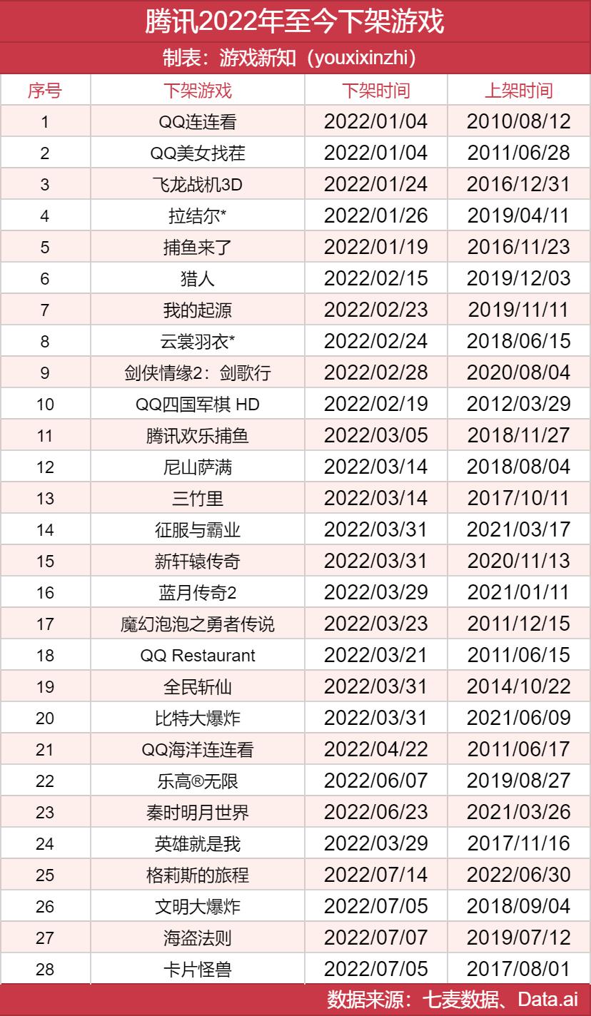 游戲領(lǐng)域,今年騰訊在國(guó)內(nèi)市場(chǎng)下架的手游多達(dá) 28 款,包括《QQ 連連看》、《QQ 美女找茬》、《全民斬仙》、《捕魚(yú)來(lái)了》、《秦時(shí)明月世界》等等。其中《QQ 連連看》、《QQ 美女找茬》運(yùn)營(yíng)時(shí)間已經(jīng)超過(guò)了 10 年,《捕魚(yú)來(lái)了》曾經(jīng)取得在 iOS 免費(fèi)榜第 3 名的成績(jī)。