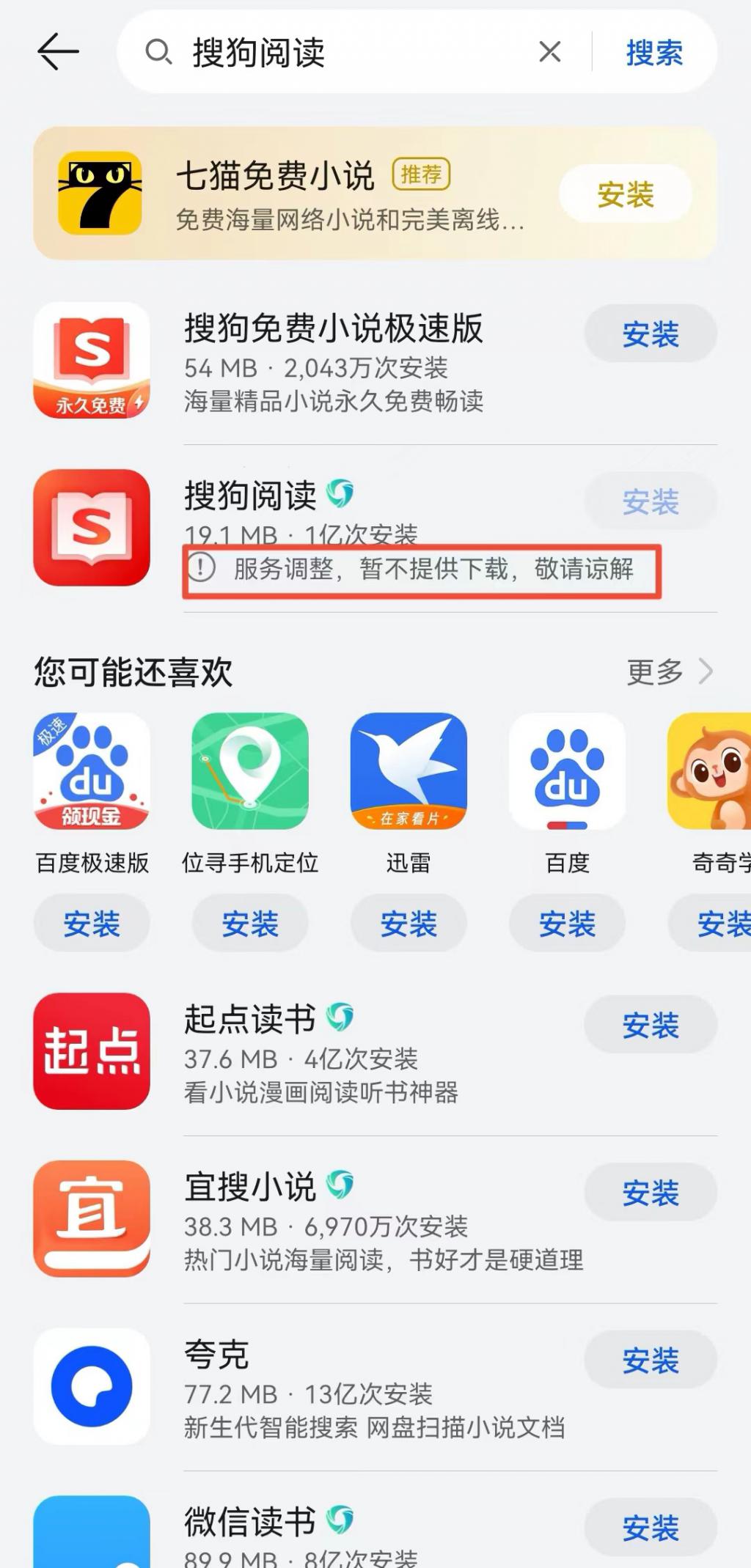 搜狗閱讀也在近期被爆出已停止運(yùn)營(yíng)。目前在安卓手機(jī)應(yīng)用商店搜索 " 搜狗閱讀 "APP 已無(wú)法下載,提示稱 " 服務(wù)調(diào)整,暫不提供下載,敬請(qǐng)諒解 "。