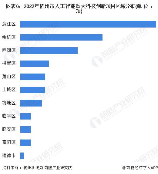 從科技創(chuàng)新項(xiàng)目來(lái)看,2022 年 9 月杭州科技局發(fā)布了《2022 年杭州市人工智能重大科技創(chuàng)新項(xiàng)目立項(xiàng)清單》。其中,濱江區(qū)以 38 項(xiàng)遙遙領(lǐng)先 ; 其次是余杭區(qū),共 23 項(xiàng) ; 西湖區(qū)為 16 項(xiàng),其余區(qū)域項(xiàng)目數(shù)量均在 10 項(xiàng)以下。