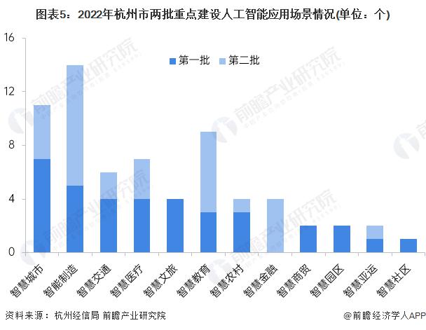 隨著數(shù)字化改革的推進(jìn),杭州的智能應(yīng)用也在加速落地。例如,杭州 "城市大腦" 在交通管理、民生服務(wù)、智慧安防等領(lǐng)域廣泛推進(jìn)人工智能應(yīng)用 ; 阿里巴巴 "SUPET 工業(yè)大腦 " 等人工智能技術(shù)助力杭州實(shí)施 " 新工廠計(jì)劃 "。2022 年 5 月以來(lái),杭州經(jīng)信局公布了兩批杭州市重點(diǎn)建設(shè)人工智能應(yīng)用場(chǎng)景名單。其中,智能制造、智慧城市和智慧教育數(shù)量排名前三,兩批合計(jì)分別為 14 個(gè)、11 個(gè)和 9 個(gè)。其余應(yīng)用場(chǎng)景還有智慧交通、智慧醫(yī)療、智慧文旅、智慧農(nóng)村、智慧金融等。