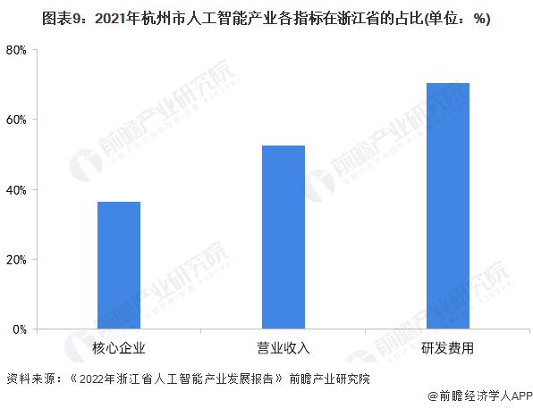 從浙江省層面來(lái)看,杭州是浙江省人工智能產(chǎn)業(yè)發(fā)展的核心區(qū)域。杭州聚集了全省 36.5% 的人工智能核心企業(yè),2021 年?duì)I業(yè)收入占全省的 52.4%,研發(fā)費(fèi)用為 225.8 億元,占全省的 70.5%。