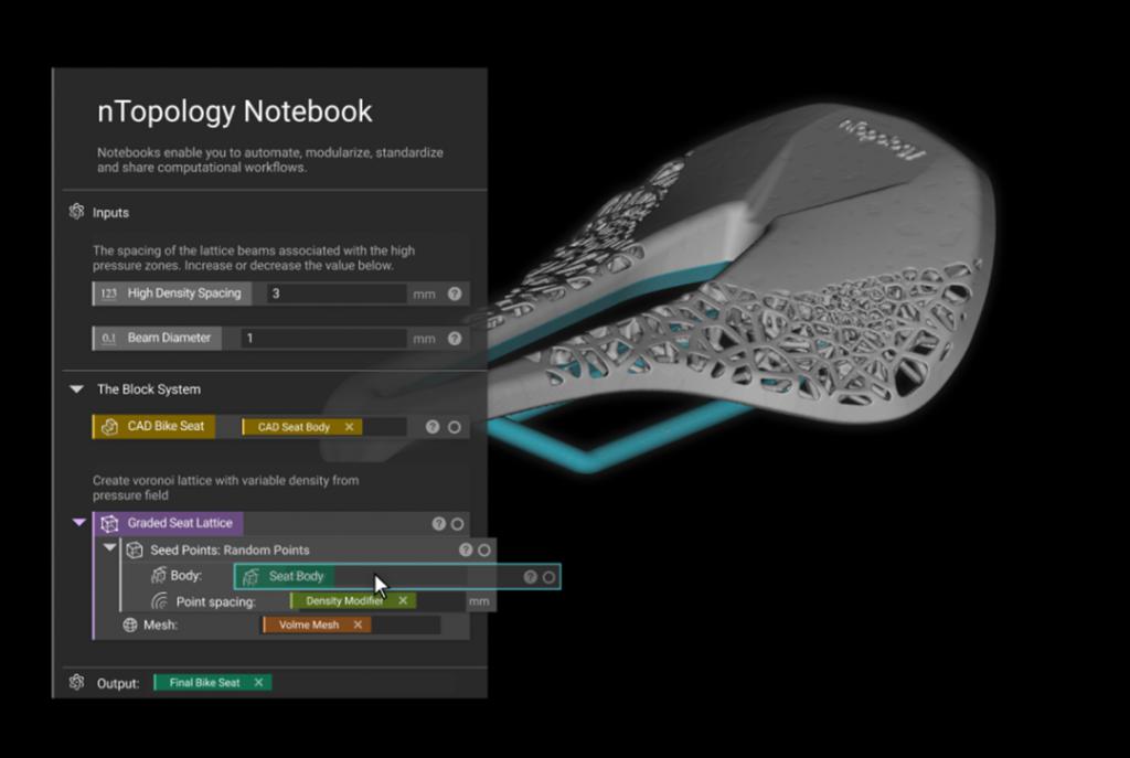 用 SDF 方程來表達一個圖形,可以讓模型體積縮小 60 倍(可以類比像素圖和矢量圖的關(guān)系)。nTop 還在工程設(shè)計工作流上進行創(chuàng)新,在一個平臺上進行 CAD、CAE、CAM 數(shù)據(jù)集成,在一個工作流中完成產(chǎn)品設(shè)計探索、驗證、生產(chǎn)設(shè)計,大幅提升了設(shè)計效率。