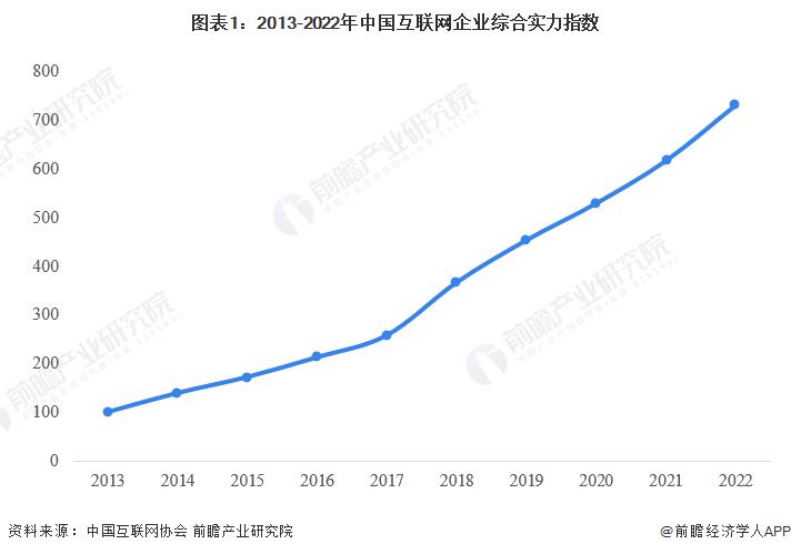 2013-2022 年,我國互聯網行業持續穩定發展。以 2013 年為基礎,我國互聯網企業綜合實力呈逐年增長態勢。具體來看,2022 年指數值高達 730.7 分,較 2021 年增長 18.5%,較 2013 年增長 630.7%。