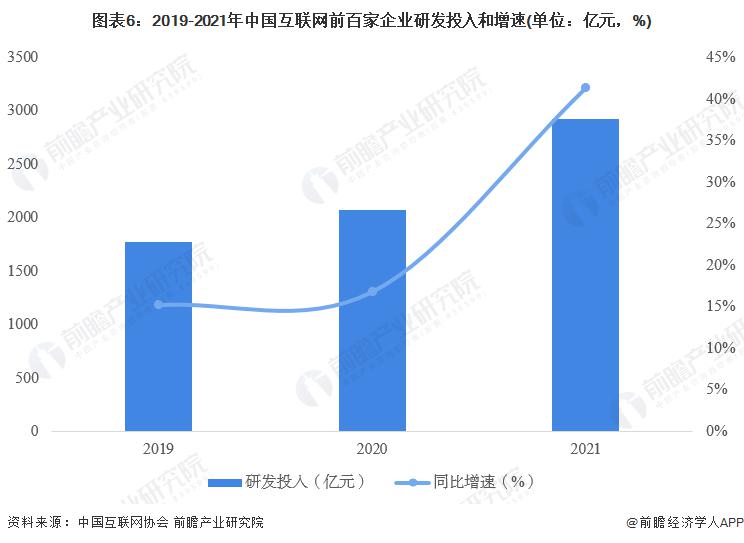 據中國互聯網協會統計,2021 年,中國互聯網前百家企業的研發投入達到 2923.7 億元,同比增長 41.3%,明顯高于 2020 年 16.8% 的增速 ; 整體研發強度 6.4%,高于 2020 年的 4.6%。由此可見,互聯網企業不斷加大研發經費投入力度。