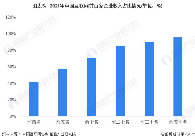 從前百家企業互聯網業務收入來看,2021 年,排名前兩位的頭部企業互聯網業務收入總額占前百家企業營業收入總額的 41.9%,同比 2020 年增長 14.9 個百分點 ; 排名前十位的頭部企業營業收入總額占比達到 71%,同比 2020 年增長 8.5 個百分點,頭部企業集中度持續上升。