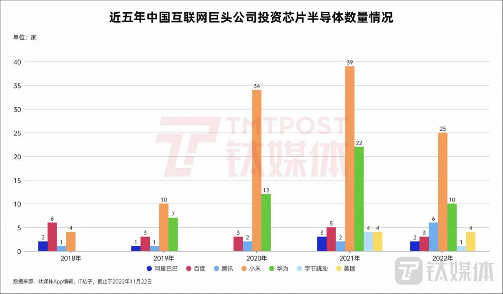 根據 IT 桔子數據顯示,自 2018 年以來,阿里、騰訊、百度、小米、華為、美團、字節跳動七大互聯網企業對芯片半導體整體投資數量不斷增長,并在 2021 年投資總量達到頂峰,至 79 起。值得注意的是,美團和字節跳動是最近兩年才開始關注芯片半導體領域投資,并在 2021 年開始布局。