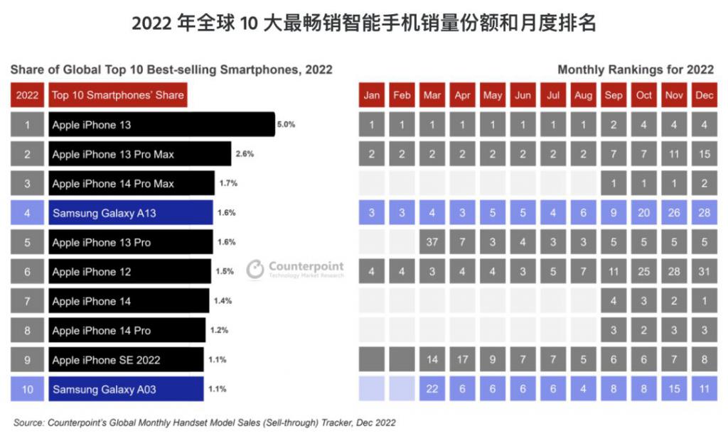 縱觀 2022 年智能手機銷售量前十名的排名中,蘋果占據了其中的八個名次,三星的 Galaxy A13 和 A03 則占據了剩下的兩個名次。