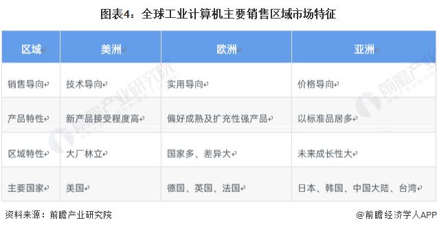 目前工業(yè)計(jì)算機(jī)主要銷售區(qū)域有美洲、歐洲和亞洲。不同區(qū)域從銷售導(dǎo)向、產(chǎn)品特性、區(qū)域特性和主要銷售國(guó)家來(lái)分具有不同特點(diǎn)