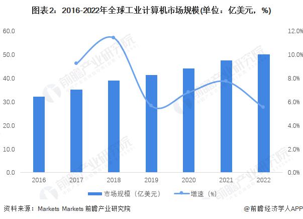 全球工業(yè)計(jì)算機(jī)市場(chǎng)短期增長(zhǎng)的主要因素是過(guò)程工業(yè)的預(yù)期投資提高以及工業(yè)計(jì)算機(jī)在工業(yè)自動(dòng)化現(xiàn)有領(lǐng)域之外的持續(xù)應(yīng)用。同時(shí),物聯(lián)網(wǎng)在制造業(yè)中的越來(lái)越廣泛的使用,這使得工業(yè)計(jì)算機(jī)可以通過(guò)廣泛的智能設(shè)備網(wǎng)絡(luò)進(jìn)行連接,從而增強(qiáng)制造工廠的自動(dòng)化程度。物聯(lián)網(wǎng)有助于獲取和生成大量制造數(shù)據(jù),因此需要工業(yè)計(jì)算機(jī)一類的設(shè)備來(lái)進(jìn)行數(shù)據(jù)采集和過(guò)程控制。據(jù) Markets and Markets,全球工業(yè)計(jì)算機(jī)市場(chǎng)規(guī)模在 2016-2022 年呈現(xiàn)逐年遞增趨勢(shì),2022 年市場(chǎng)規(guī)模達(dá)到 50 億美元,同比增長(zhǎng) 5.5%。