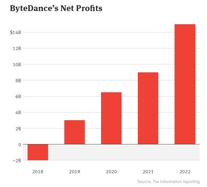 知情人士對 The Information 表示,去年字節跳動的營業利潤增長了 80%,達到 180 億美元,凈利潤增長 67%,至約 150 億美元;營業利潤率為 21%,正在靠近 Meta 的 25% 和 Alphabet 的 26%。